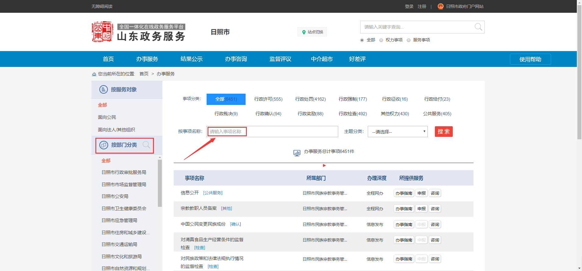 2.在“办事服务”页面根据需要办理的具体事项在左侧“按部门分类”中查找该事项所在的部门,然后在该部门下查找具体办理的事项,也可在事项名称框中直接输入事项名称进行查找。